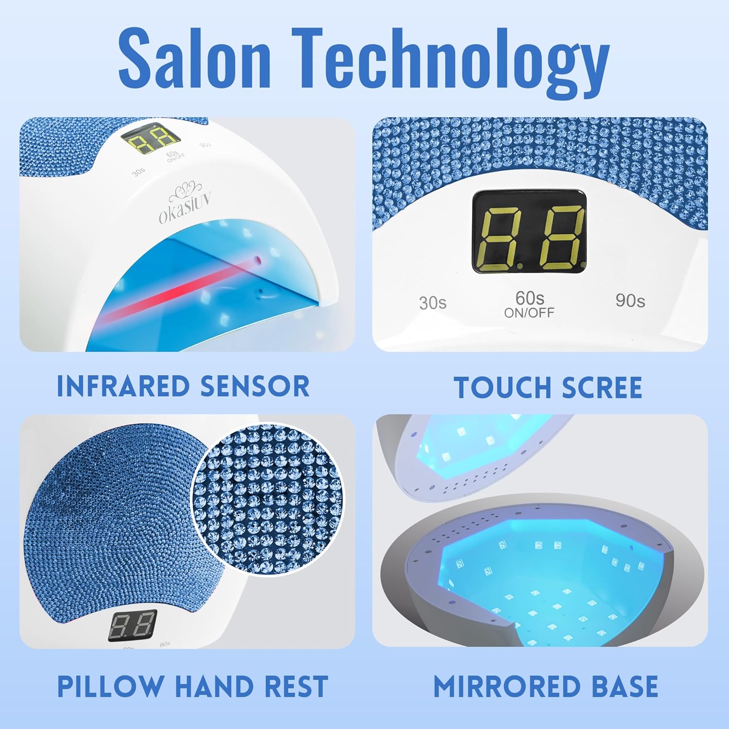 - 【Fits ALL Gel Polishes & Extensions】Okasiuv works with hard gel, polygel, dip powder, acrylics, and more. Say goodbye to undercured nails—this lamp delivers salon-perfect results every time