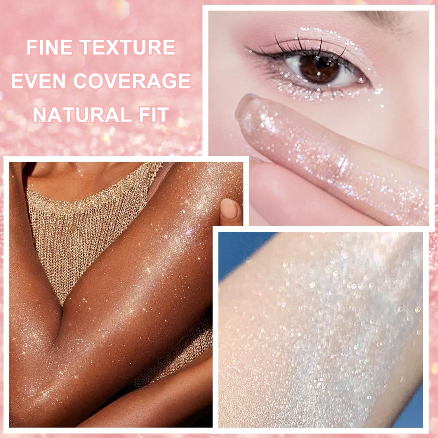 - Glitter Highlighter Powder - The extra finest powder super easy to apply and adheres well to the skin, keep glitter makeup last for hours without greasy, wonβt crease, cake or clog pores, smooth your skin and natural glow like sunshine.