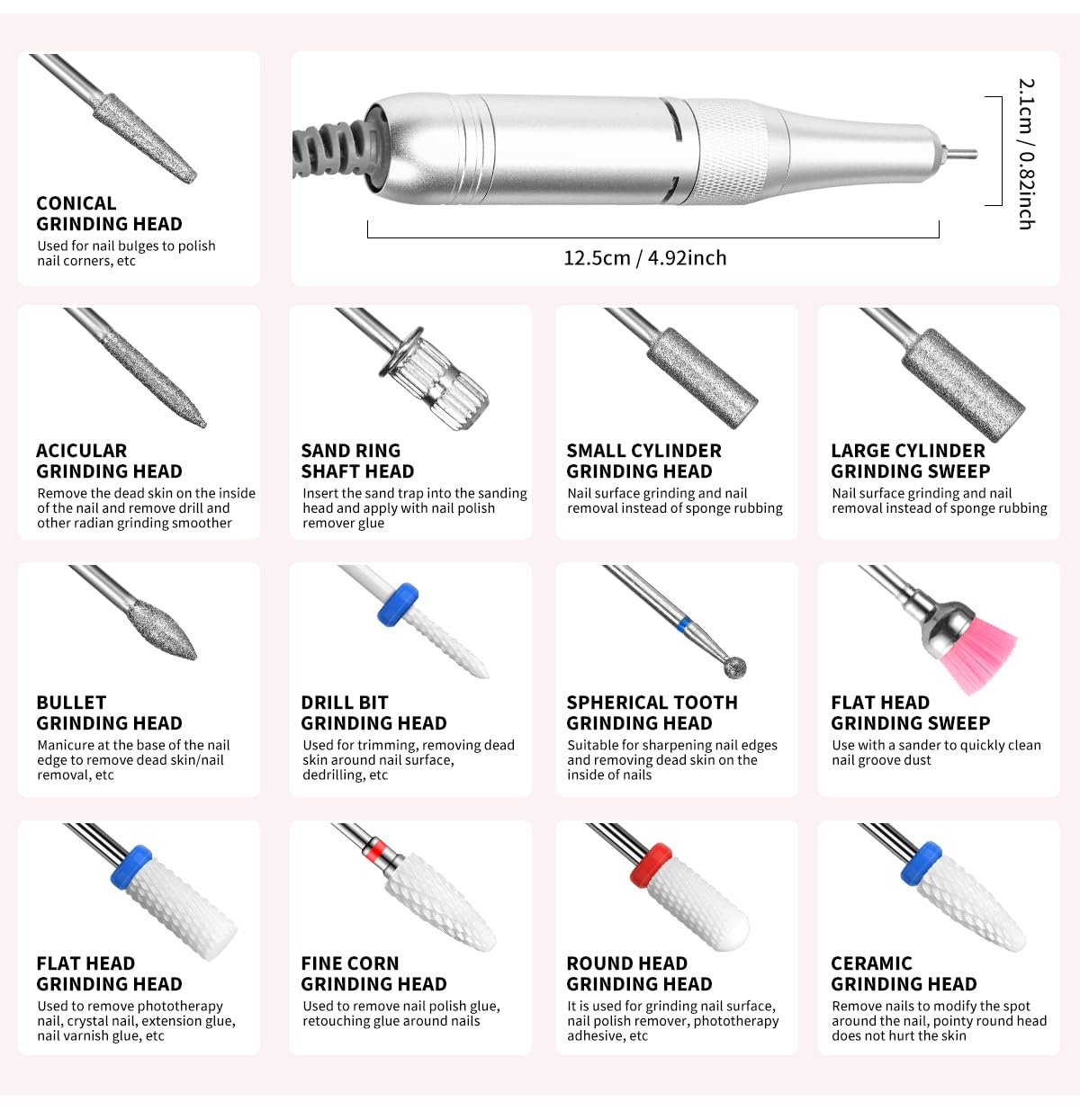 - All-in-One Professional Kit for Every Nail Need: Outfit your toolkit with 11 premium drill bits and 51 sanding bands—the most versatile collection for acrylics, gels, cuticles, calluses, and natural nails. From delicate detailing to heavy-duty shaping, this kit handles it all. The built-in storage base keeps accessories organized and within reach, turning chaotic workspaces into tidy, efficient stations. Perfect for pros who demand variety and beginners learning the ropes.