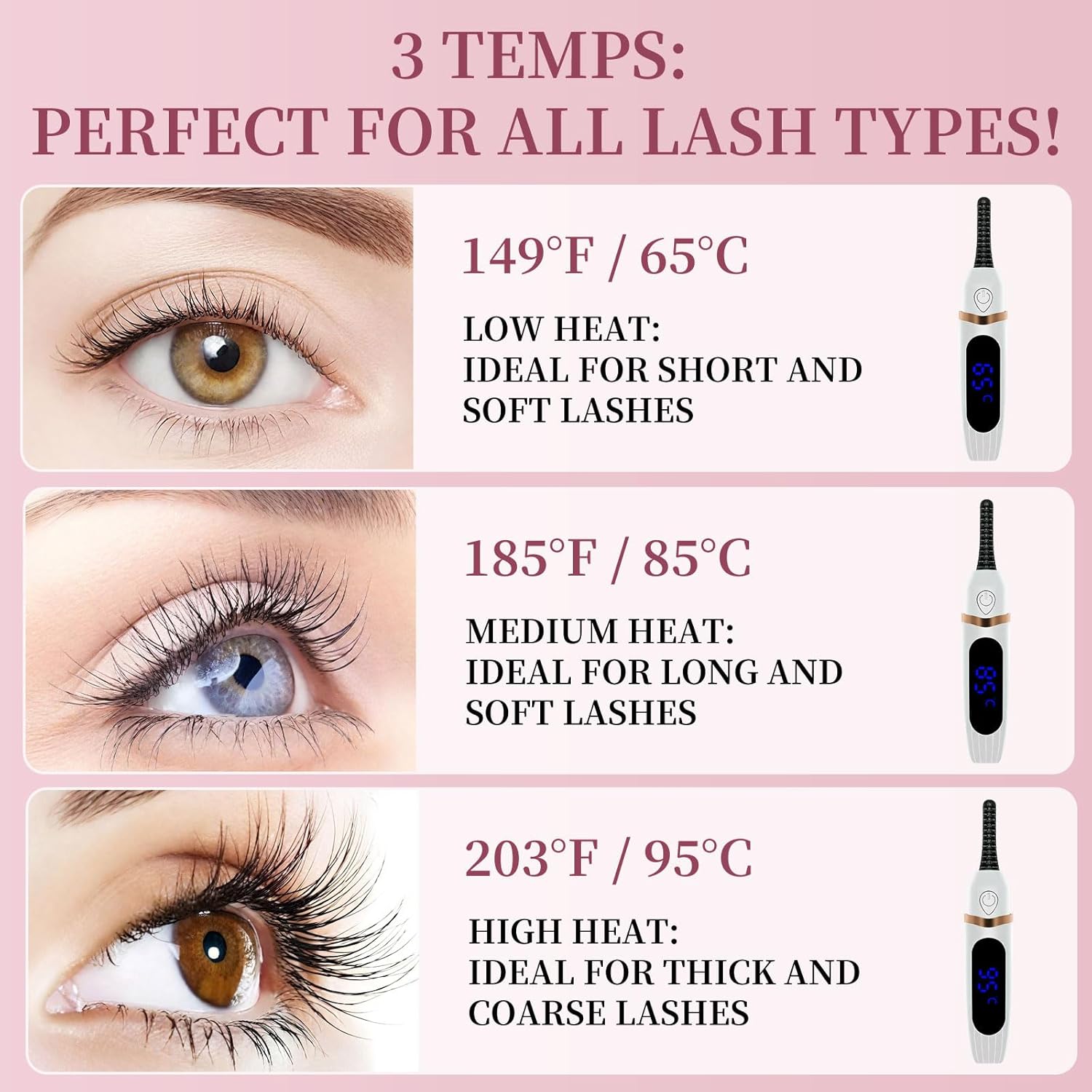 - 【Three Adjustable Temperatures for All Lash Types】Our rechargeable eyelash curler features an LED display with three temperature settings—65℃ (149℉), 85℃ (185℉), and 95℃ (203℉)—to suit different lash types. Whether your lashes are fine, thick, straight, or curly, easily choose the ideal heat level with a button press for perfect, customized curling every time.