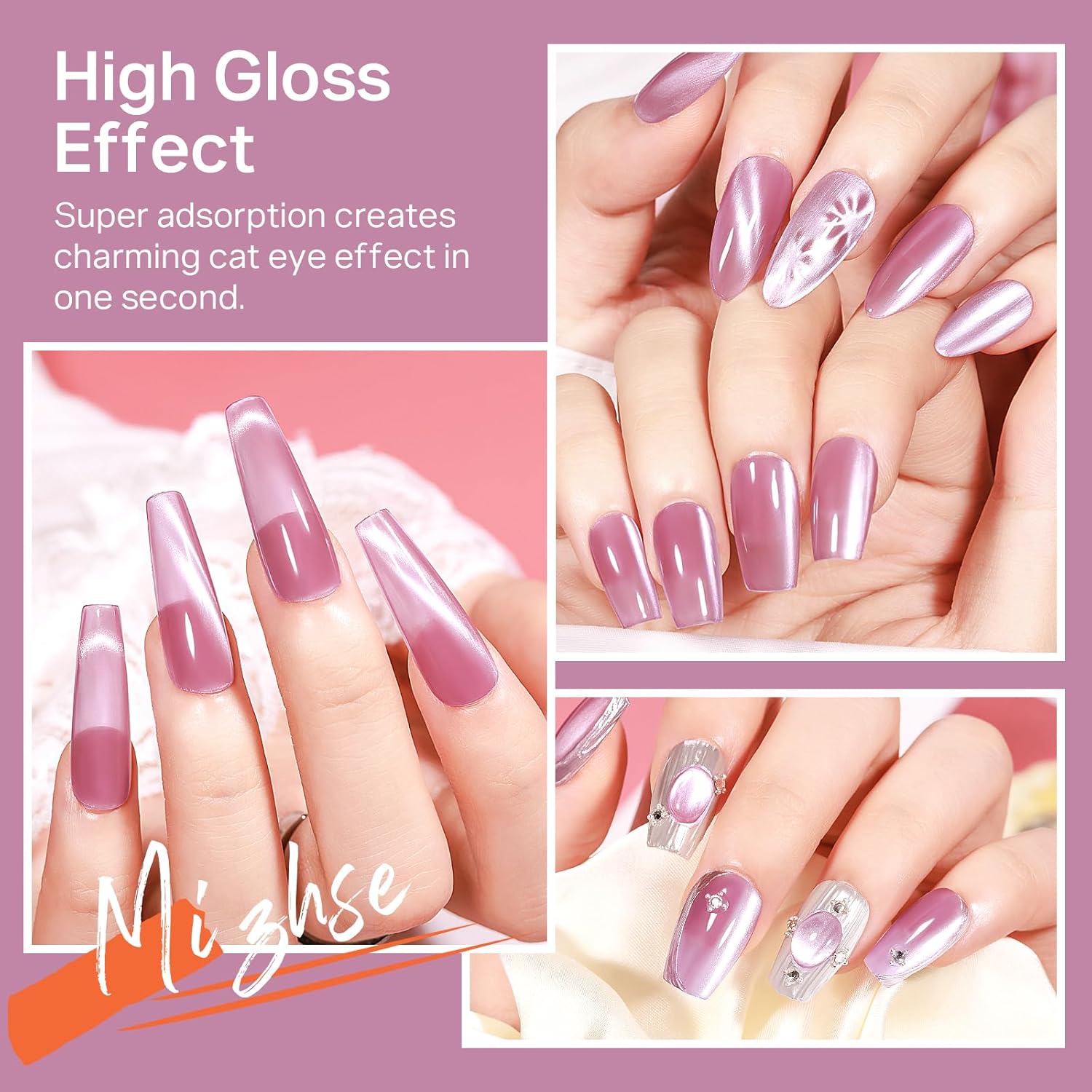 MIZHSE Quick Dry Cat Eye Nail Polish, Pink-Purple Magnetic Nail Polish with Magnet, Air Drying Fast 15ml Cateye Nail Lacquer for Women Girls Non-Gel Nail Art Manicure DIY Home