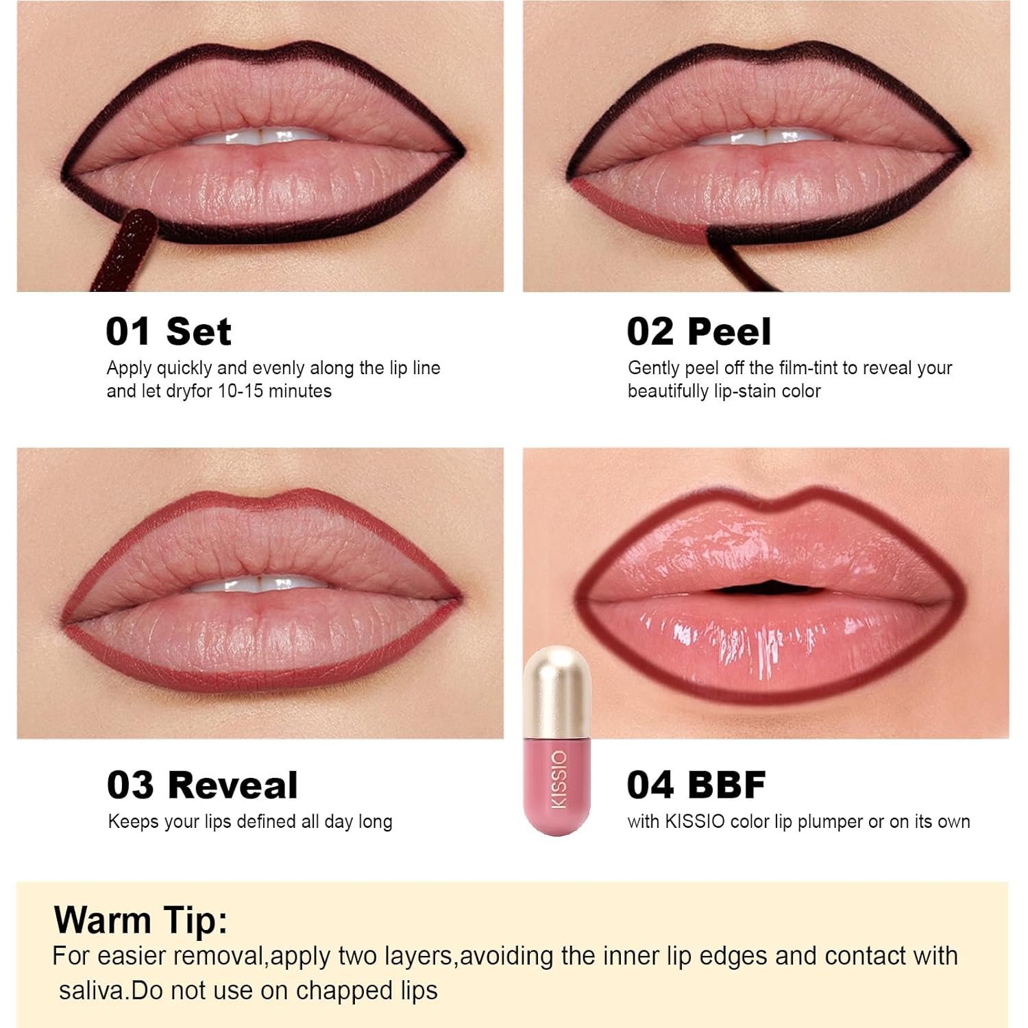 • Easy To Use:Clean lips and keep them dry,use the tip to trace an even layer along the lip line or apply to the entire lip, simply leave it on for 10-30 minutes - The longer it stays, the more the color settles.Allow the formula to set and slowly peel off the film and you'll have bright lip color for hours or even all day long - it won't transfer even when eating or drinking.Can use any oil-based makeup remover to easily remove your makeup