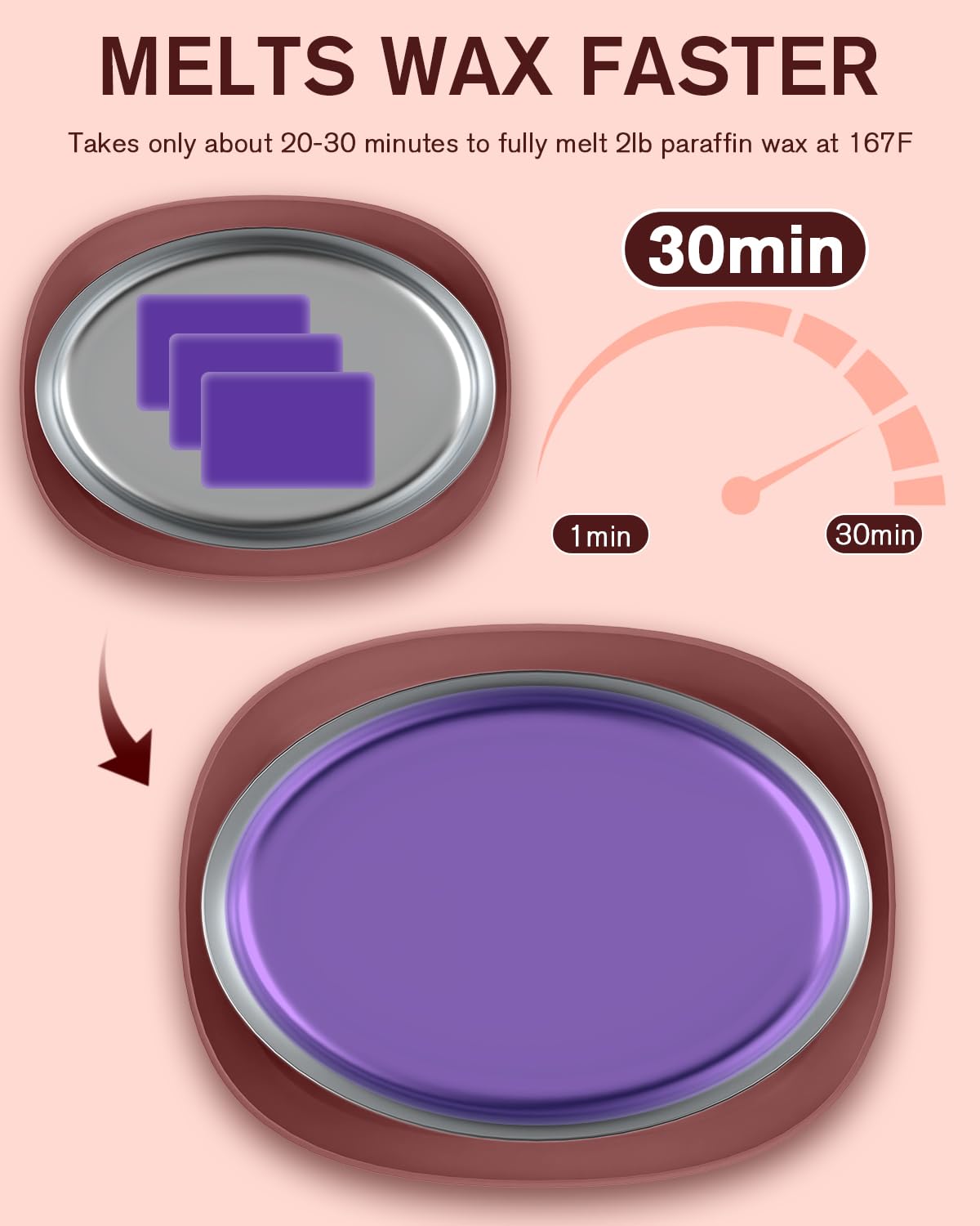 - Large Capacity / Quick Heat: paraffin wax machine has a large opening inner container , which offers you enough space to dip your hands, elbows or feet in paraffin warmer machine. Melts wax quickly and evenly , takes just 30 minutes to fully melt 2 lbs of paraffin wax at 167 Β°F. Turn Off the machine when dipping