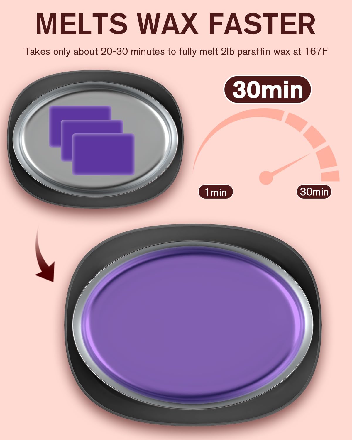 - Large Capacity / Quick Heat: paraffin wax machine has a large opening inner container , which offers you enough space to dip your hands, elbows or feet in paraffin warmer machine. Melts wax quickly and evenly , takes just 30 minutes to fully melt 2 lbs of paraffin wax at 167 Β°F. Turn Off the machine when dipping