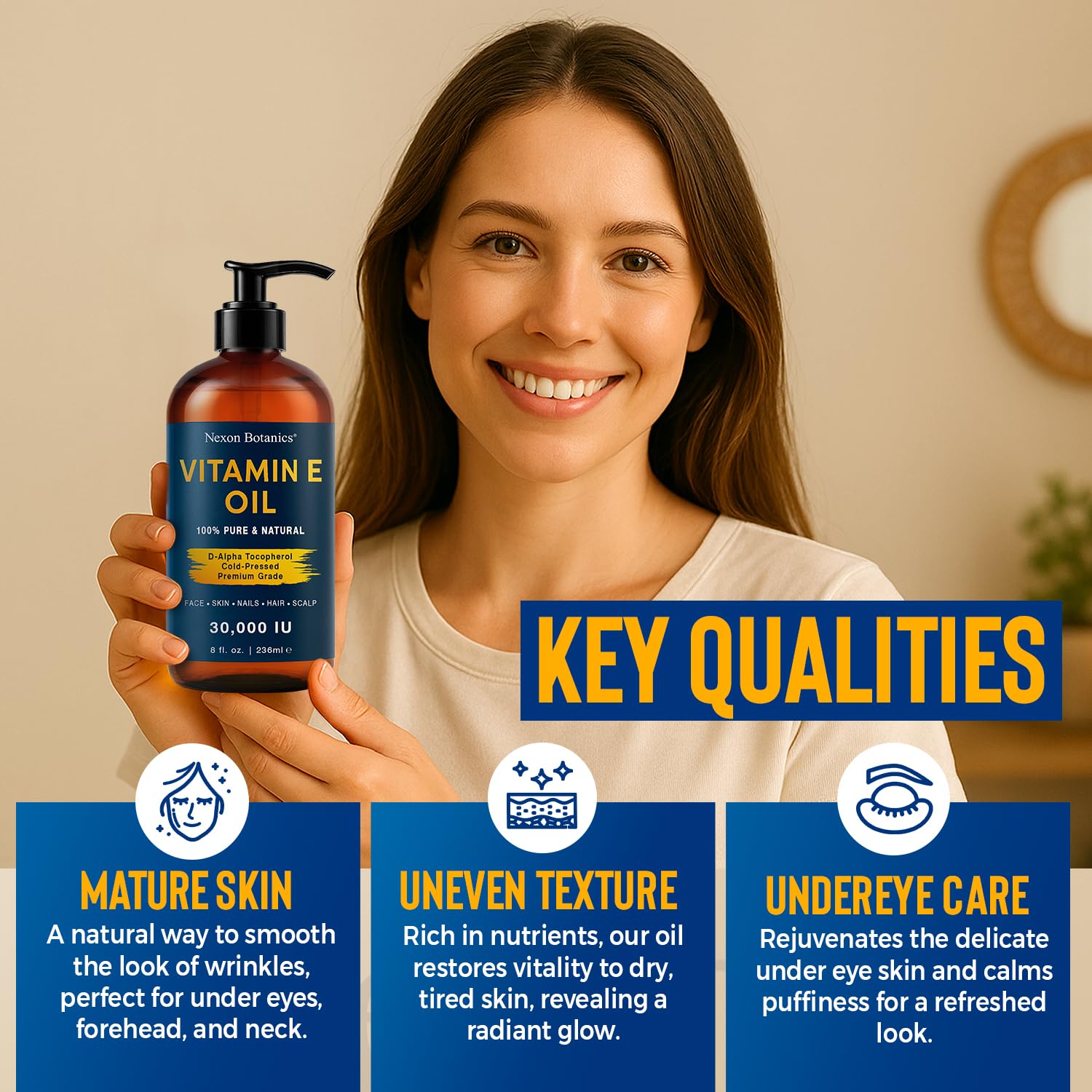 Pure Vitamin E Oil 30,000 IU, 8 fl oz - Cold-Pressed, Hexane Free, Natural Moisturizer for Skin & Face - Supports Scar & Stretch Mark Care by Nexon Botanics