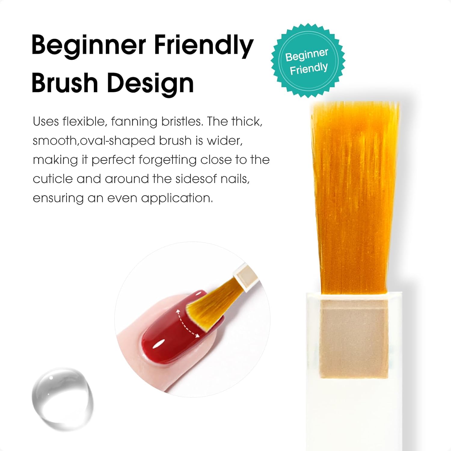 - Beginner Friendly:Brush Uses flexible, fanning bristles.The thick, smooth, oval-shaped brush is wider, making it perfect for getting close to the cuticle and around the sides of nails, ensuring an even application.