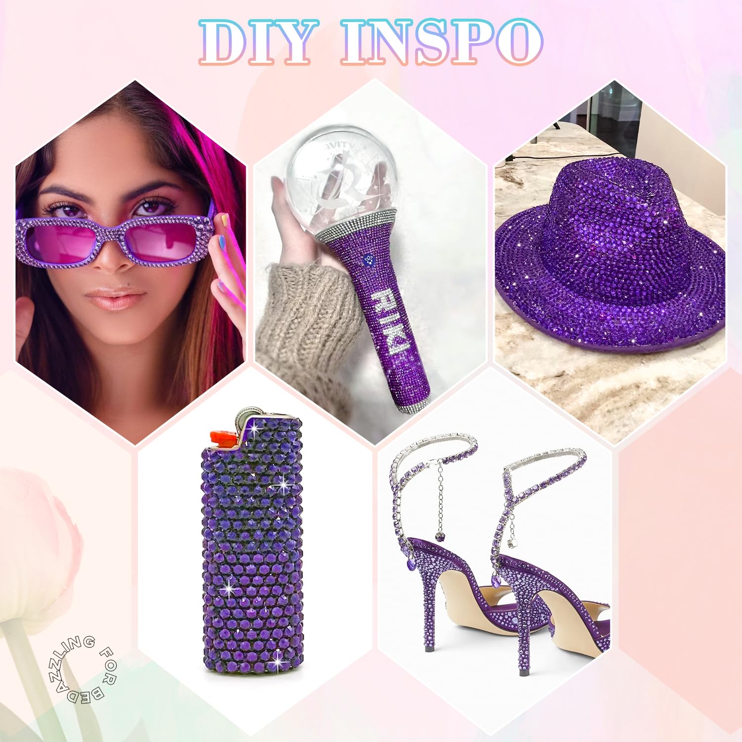 • PACKAGE CONTENT – This all-in-one bedazzler kit includes everything you need to start creating dazzling designs: 1 box of purple rhinestones with 24 grids (approx. 30,000 pcs of bedazzling rhinestones assorted size SS6/10/16/20/30 ), 1 precision tweezers, 1 pickup pen for handling small gems, and 3 tubes of B7000 jewelry glue for secure application.