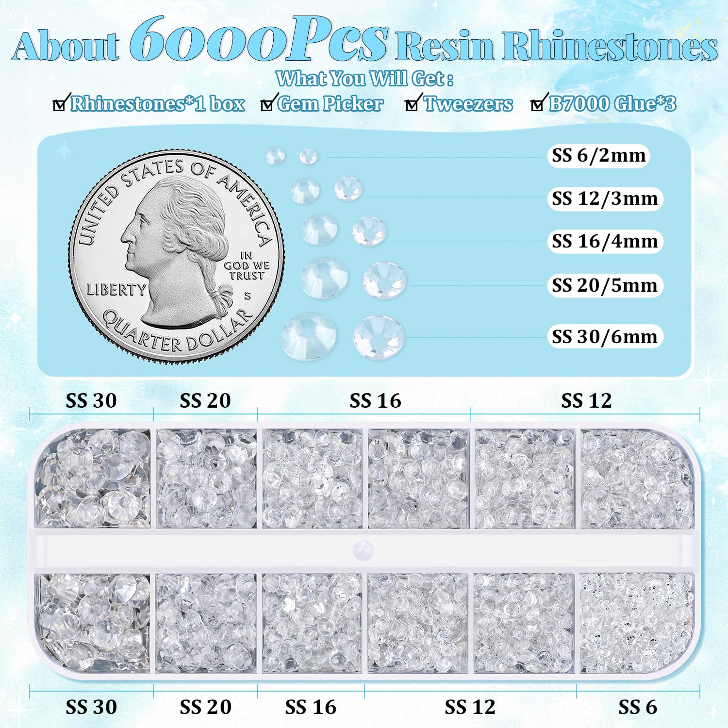 - WHAT YOU WILL GET -- The package includes 1 box of flatback rhinestones with 12 grids in diffrent sizes(2/3/4/5/6mm). 1 tweezers for large size gems, 1 pickup pen for small size gems. 3 B7000 adhesive jewels glue for jewelry making