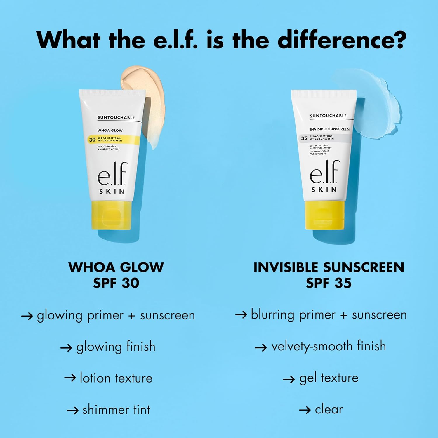 - LIGHTWEIGHT GEL SUNSCREEN: The clear choice in sunscreen is e.l.f. SKINβs Suntouchable Invisible SPF 35. This clean, lightweight gel sunscreen delivers invisible broad-spectrum SPF 35 protection and leaves zero white cast on all skin tones.