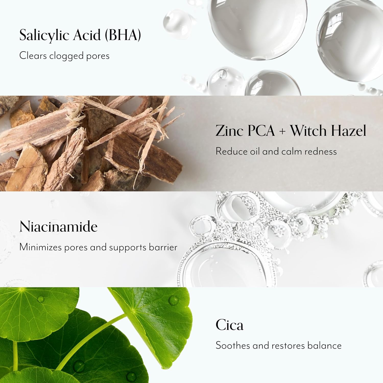 - KEY INGREDIENTS: BHA (SALICYLIC ACID): Helps loosen dirt and excess oil from congested pores while promoting the easy removal of dead skin on the surface. WITCH HAZEL: A natural astringent that helps soothe and tone while decongesting clogged pores. NIACINAMIDE: Helps minimize the look of pores and blemishes while boosting skinβs protective shield. ZINC PCA: Helps to regulate skinβs oil production while calming the appearance of redness. CICA: Known to calm and soothe skin."