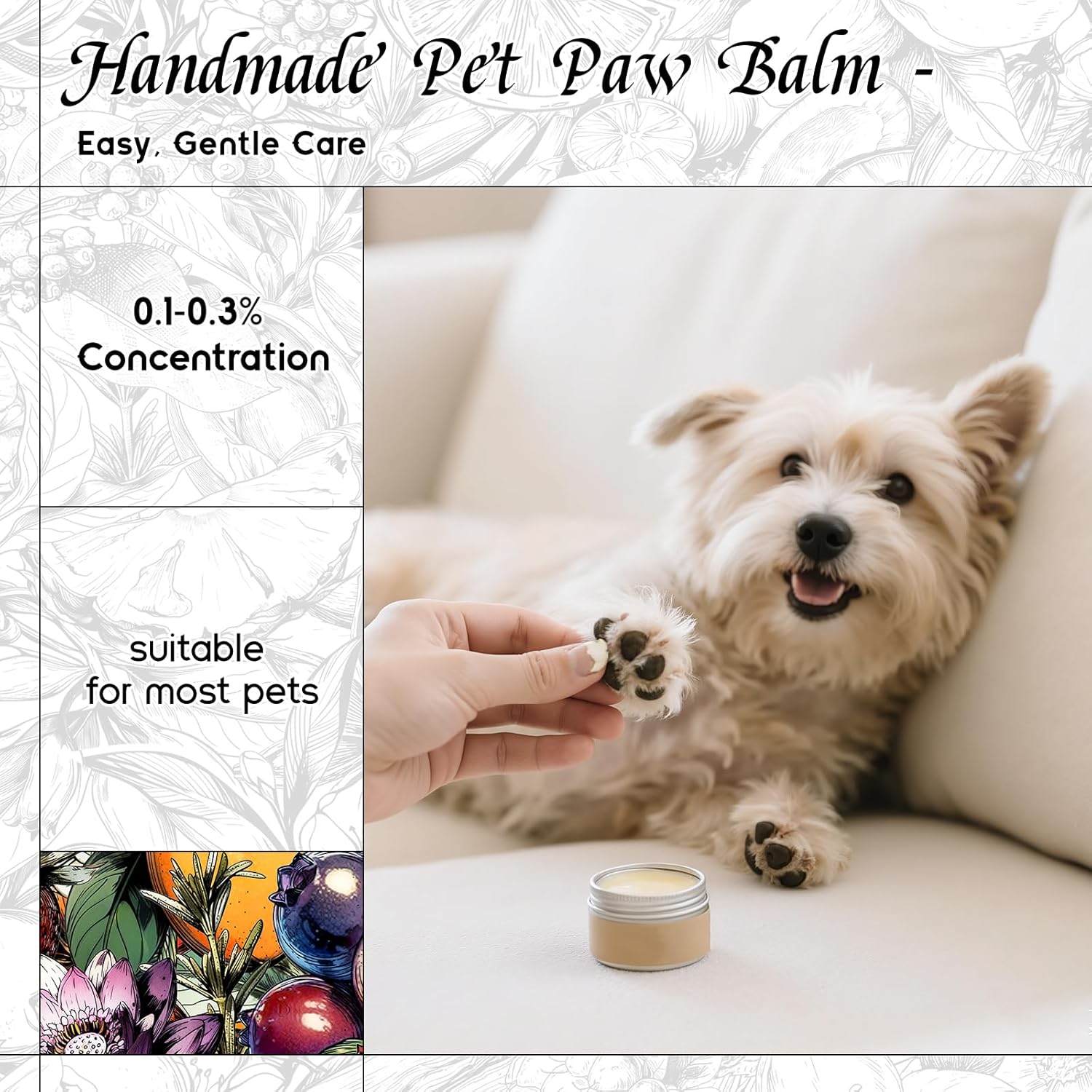 - Pet-Safe β A gentle, pet-friendly formula suitable for homemade paw balms and sprays. Free from harsh alcohols