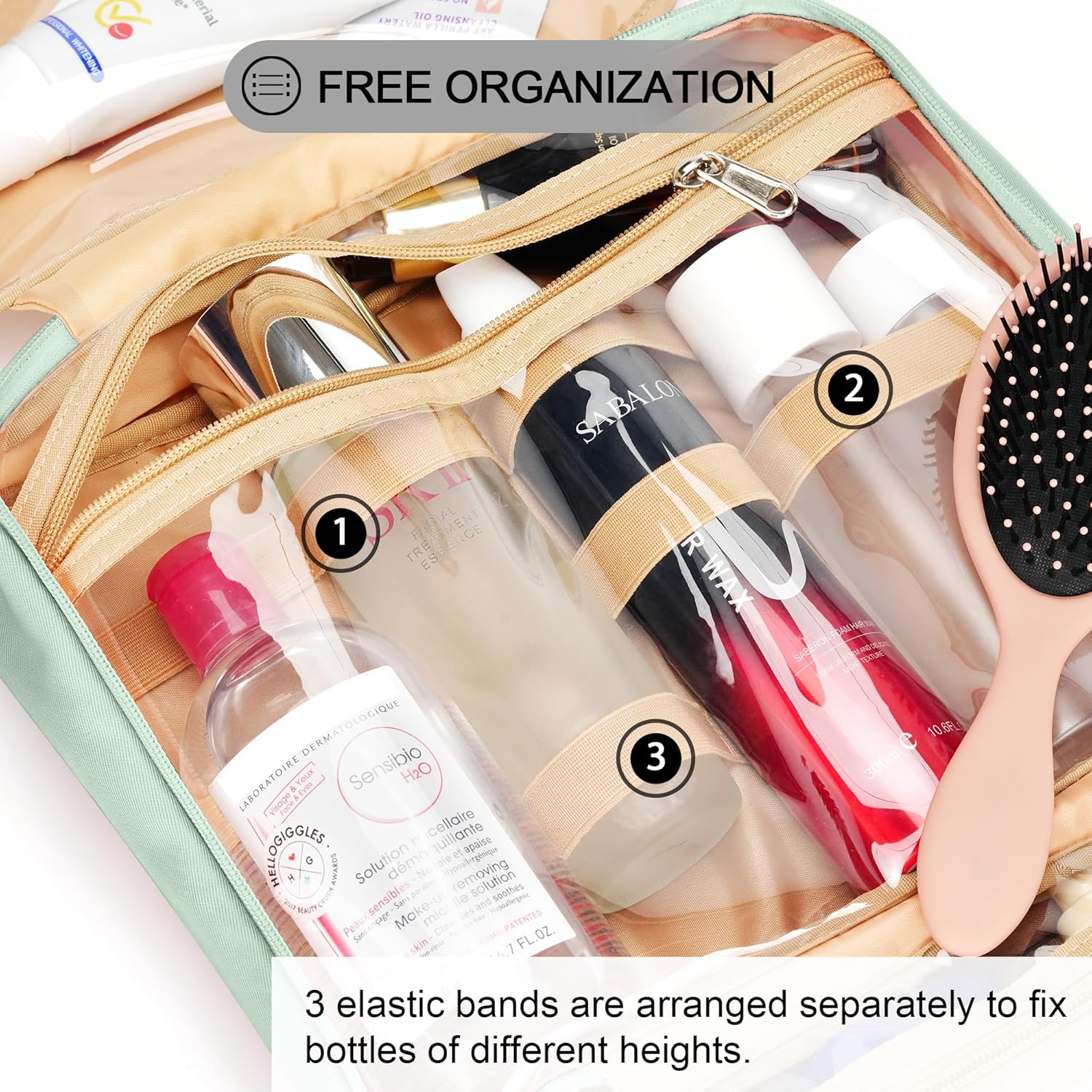 - CONSIDERABLE DESIGN - The elastic bands inside the two main compartments can keep the different height bottles fixed and upright. Your comb, toothbrush, razor, and leak-prone makeup can all go in there, even a hair dryer. 360Β° metal hook gives you a variety of hanging options.