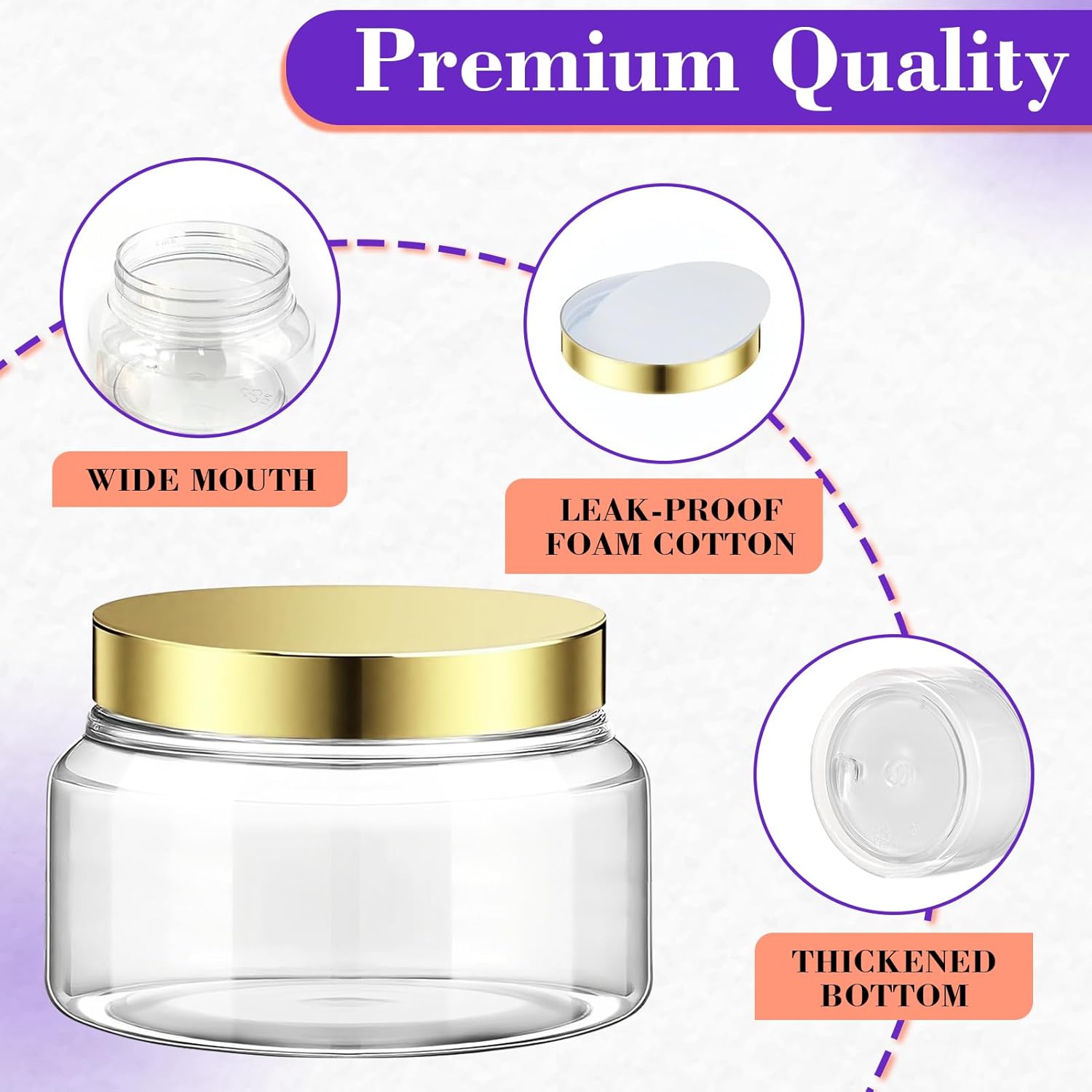 36 Pack 5 oz Plastic Cosmetic Containers With Lids Refillable Clear Empty Travle Jars Containers for Body Butter,Sugar Scrubs,Cream,Lotions,Candy, Waterproof Label&Spatulas - (Gold)