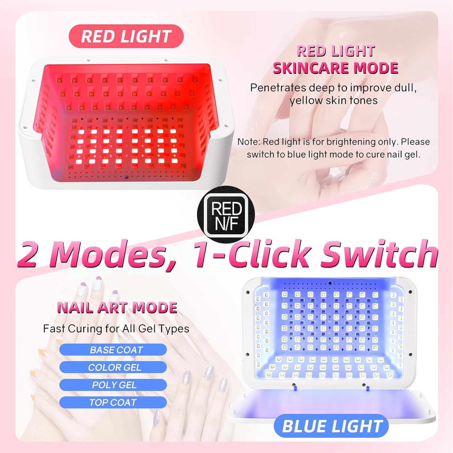 - Red Light Skincare Support: Gentle red light adds a subtle brightening effect, giving your hands a healthy glow while you do your nails. Note: Red light is for cosmetic support only. Use blue light mode to cure nail gels.