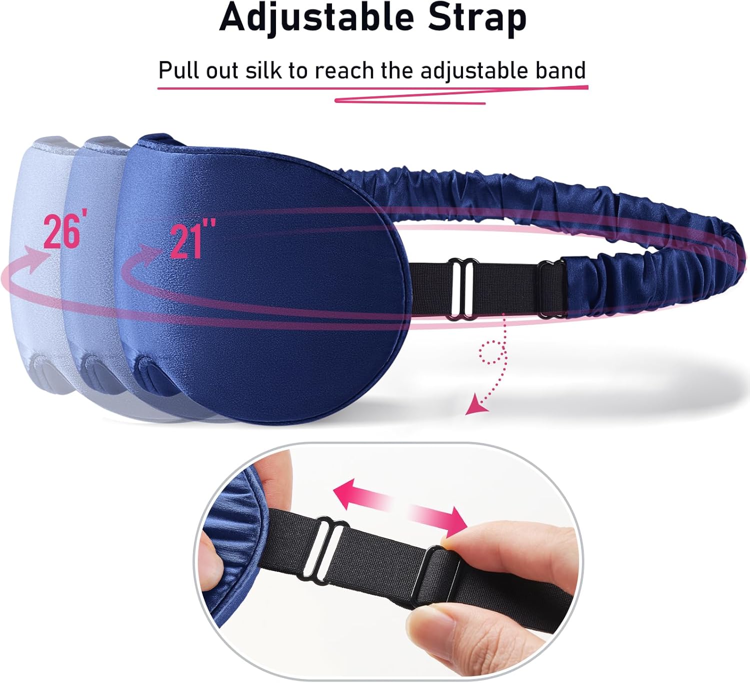 - Adjustable Strap: Our elastic buckle strap covered with 100% Mulberry silk on both sides, making it so comfy on your head, and doesn't tangle/stick your hair unlike other masks can be easily adjusted from 21 inches to 26 inches to fit all different head sizesβmen, women, and kids