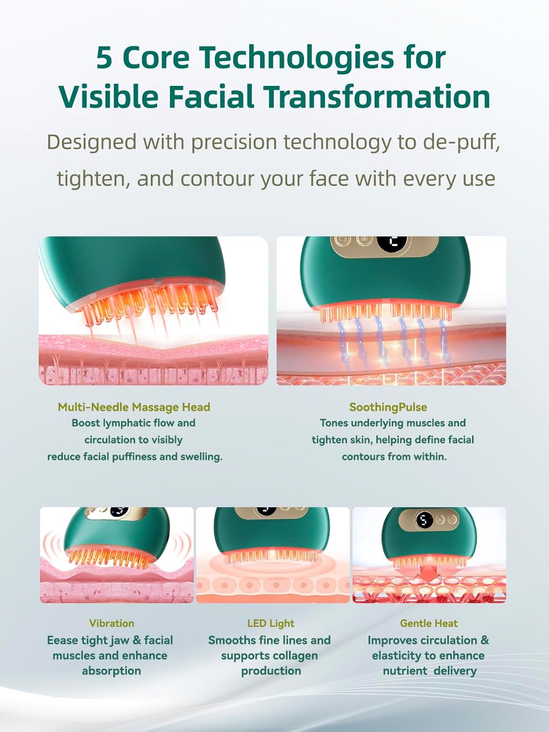- 【 Advanced Lymphatic Drainage for Face – De-Puff & Detoxify 】 This lymphatic contour face brush combines multi-needle massage and SoothingPulse to gently activate facial lymphatic drainage. It reduces puffiness, bloating, and water retention, especially in the cheeks and jawline. Improved circulation helps reveal a more sculpted, refreshed, and radiant complexion.