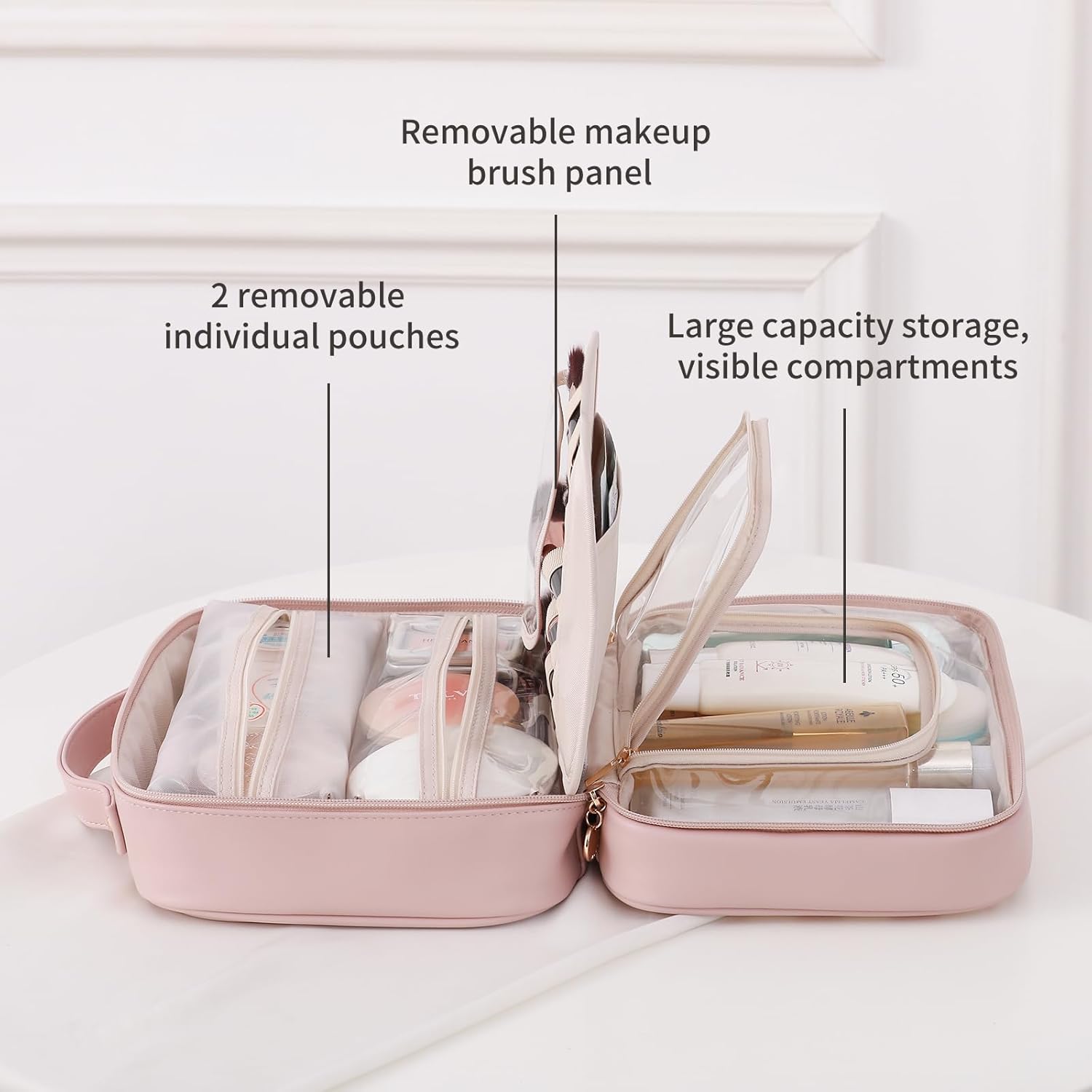 - Removable Compartments:In addition to 1 large compartment, it also includes 2 removable transparent dividers and 1 removable makeup brush panel with Velcro fastening. The individual pouches can be used as standalone clear cosmetic organizers