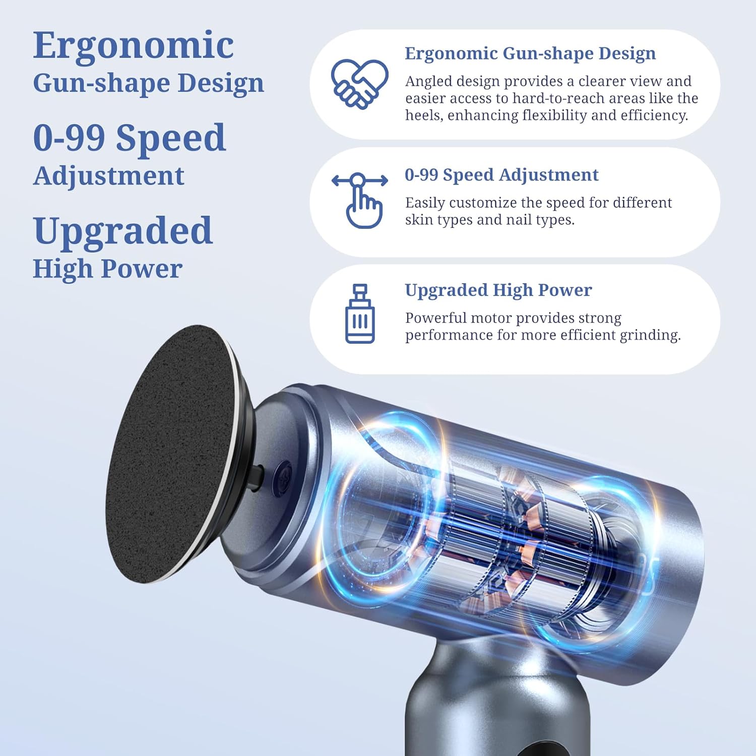 - [0-99 Speeds & High Power] -PELCAS Electric Foot File can adjust the speed from 0 - 99 levels, allowing you to easily customize the speed according to different skin types and nail types. The powerful motor provides strong performance for more efficient grinding. High-speed and stable rotation ensures smooth operation and is not easy to stall, making foot care easier and more effective. At the same time, it makes nail polishing more even, delicate and controllable.