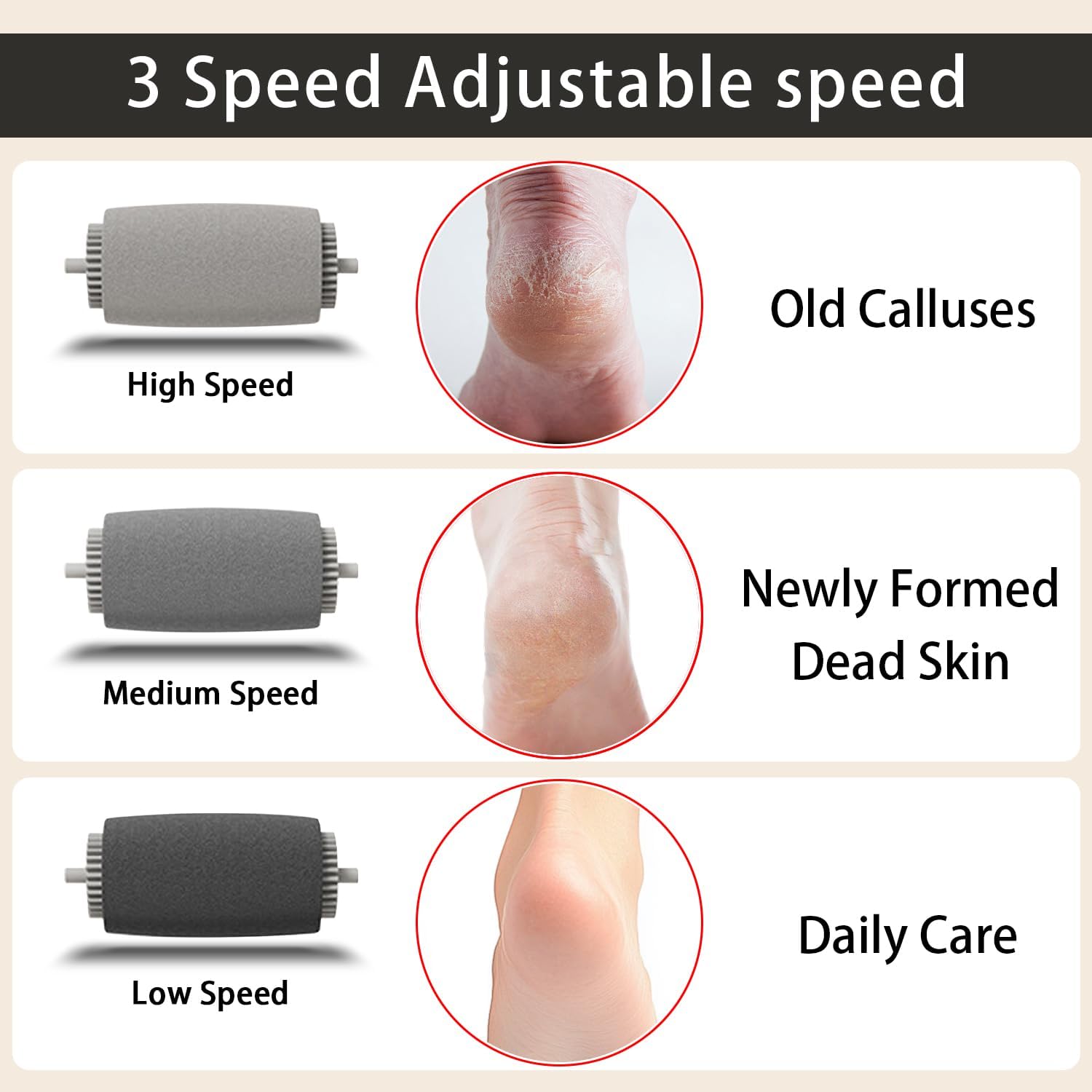 - 3-Speed Precision & Replaceable Heads: 3 adjustable speeds adapt to your skin's need. Swap between three abrasive heads for varying roughness level—ideal as a callus shaver for feet, hands, or toes. Perfect for dead skin scraper without irritation.