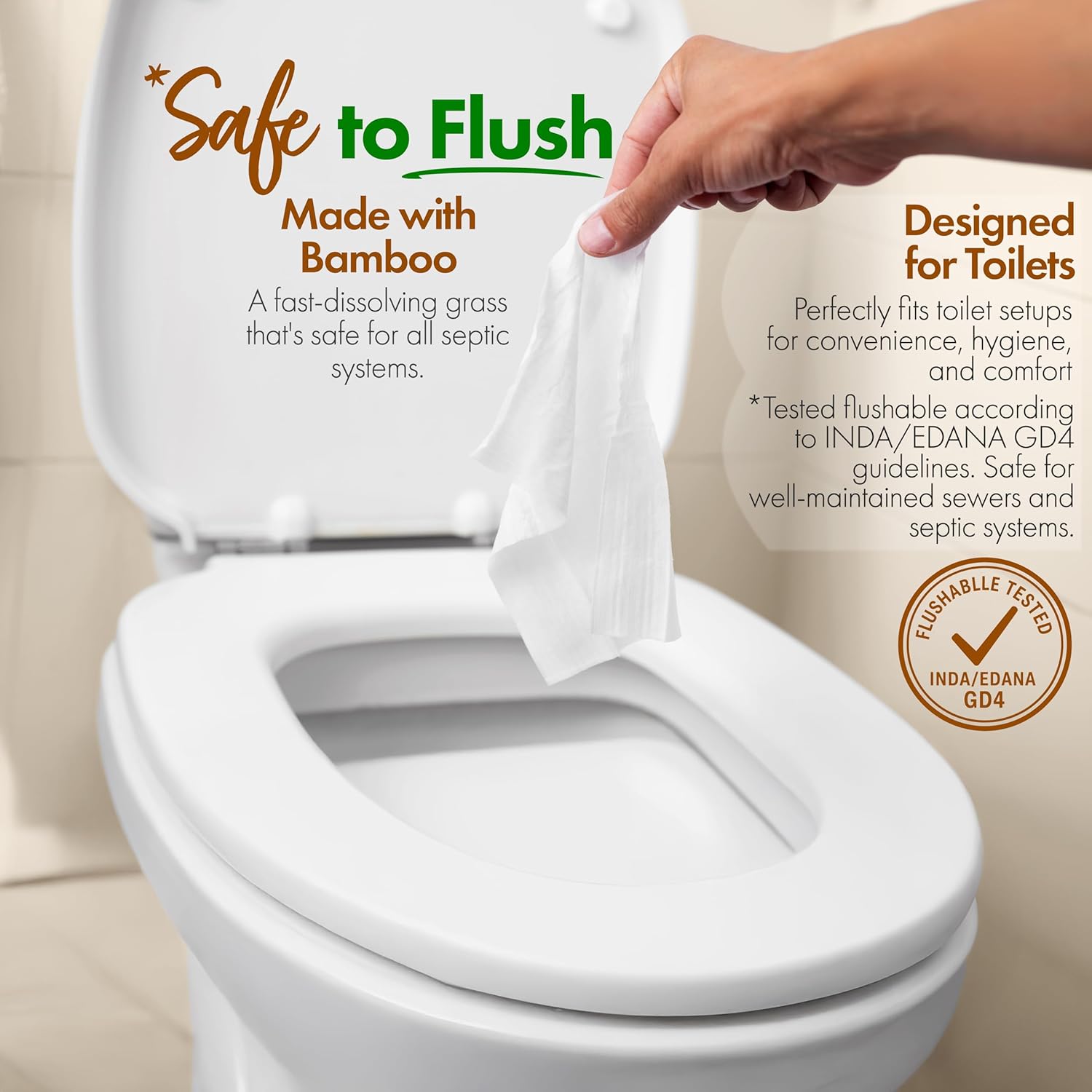 - Crafted from FSC Certified Bamboo Viscose – Silky-smooth, tear-resistant, biodegradable flushable wipes for adults; gentle enough for daily personal care. Made from material certified by GTTC and INDA/EDANA (GD4)