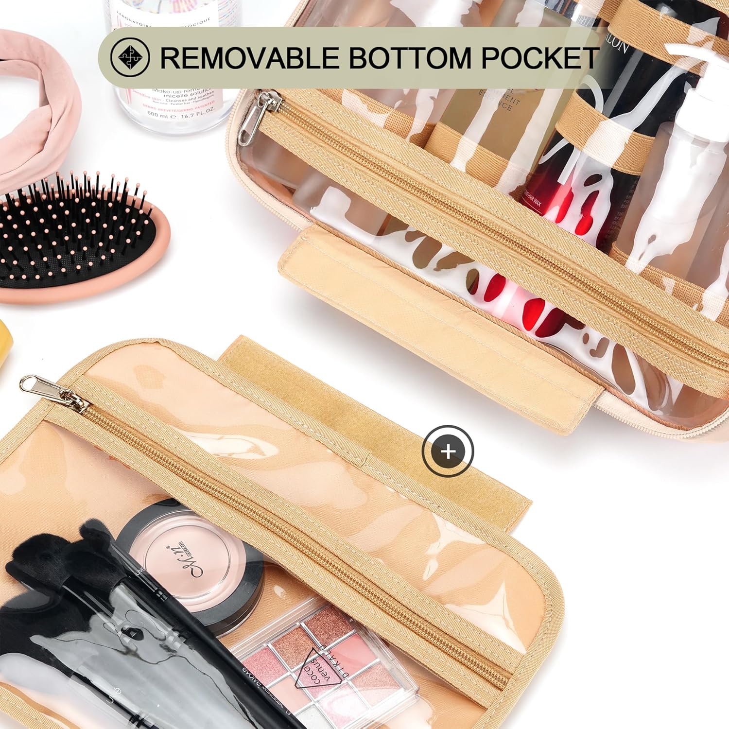 - CONSIDERABLE DESIGN - The elastic bands inside the two main compartments can keep the different height bottles fixed and upright. Your comb, toothbrush, razor, and leak-prone makeup can all go in there, even a hair dryer. 360Β° metal hook gives you a variety of hanging options.
