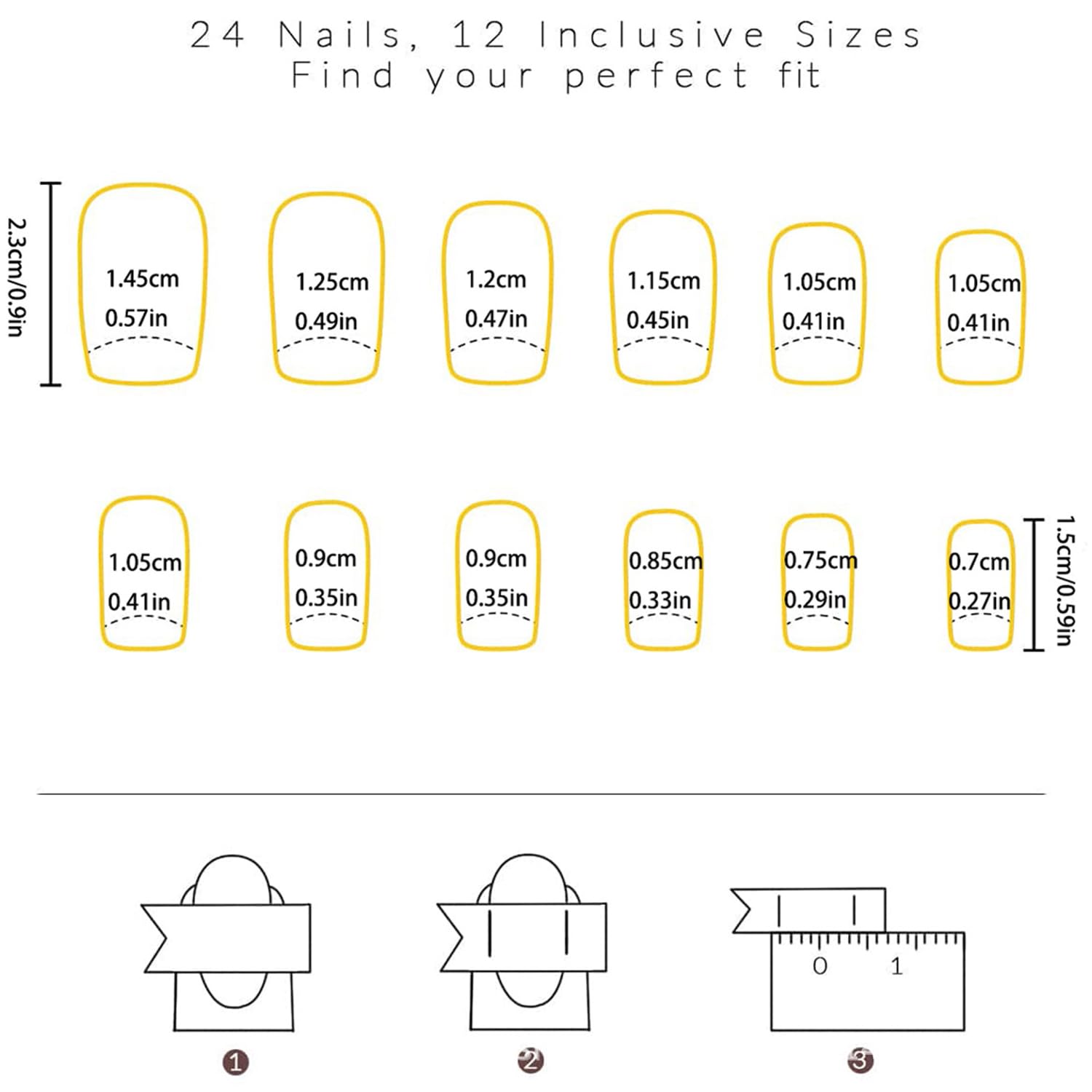 - Package: You'll get 24 fall fake nails in 12 sizes. 1 mini nail file, 1 small wooden stick, 1 piece of adhesive tab glue. You can safely choose a fake nail that fits your finger size and DIY your desired nail shape